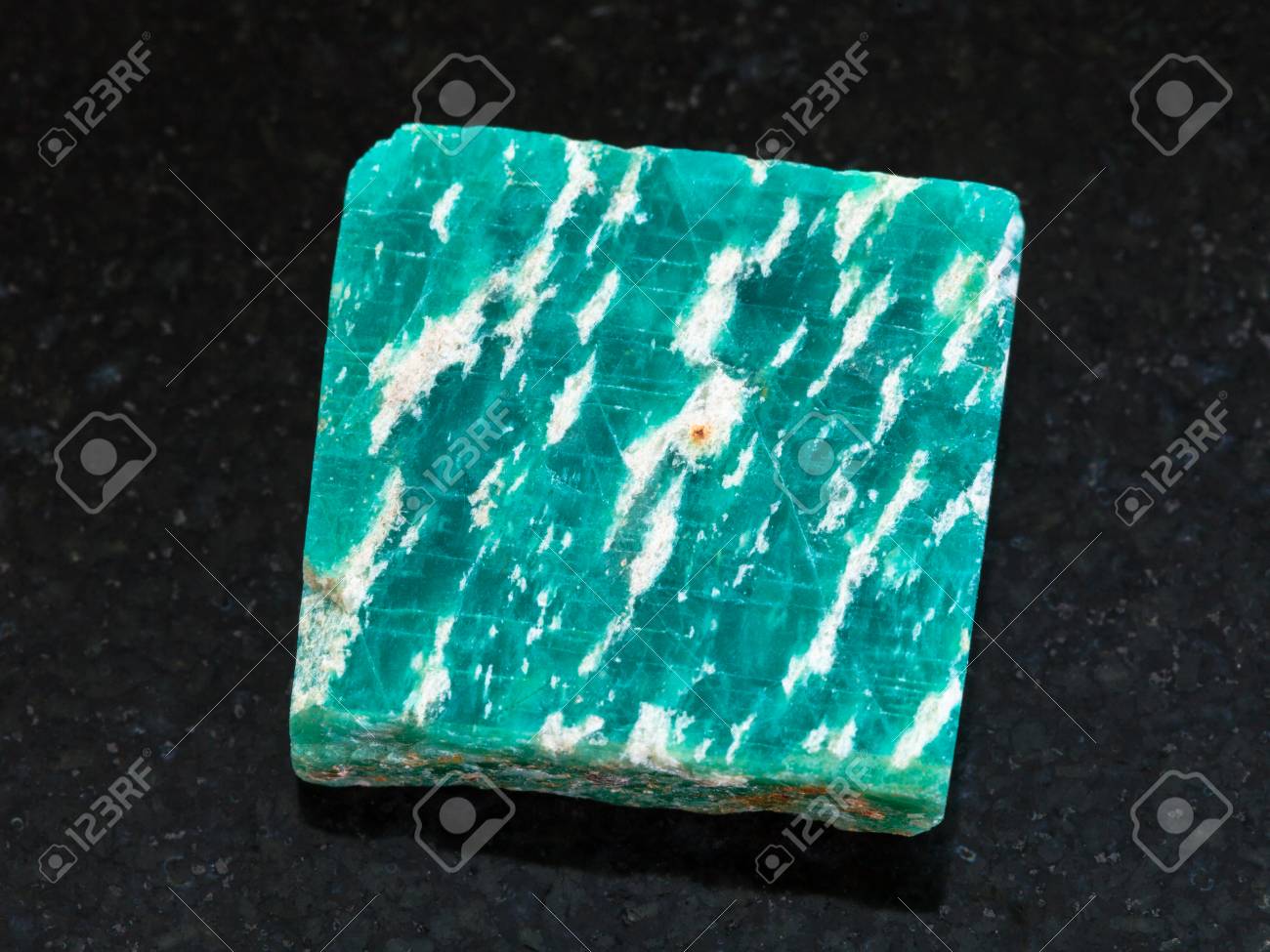 Macro Shooting Of Natural Mineral Raw Amazonite Stone On Black Granite From Ural Mountains Canstock